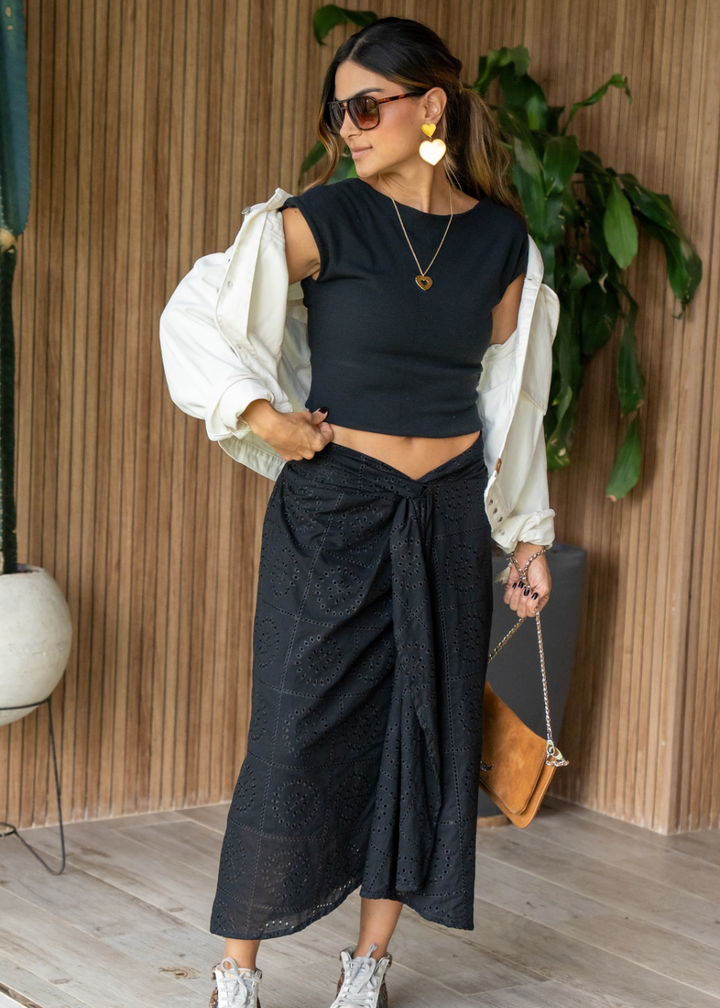 Falda en ojalillo color negro. Pretina ancha con nudo y recogido en delantero, nido de abeja en pretina posterior y forro interno.