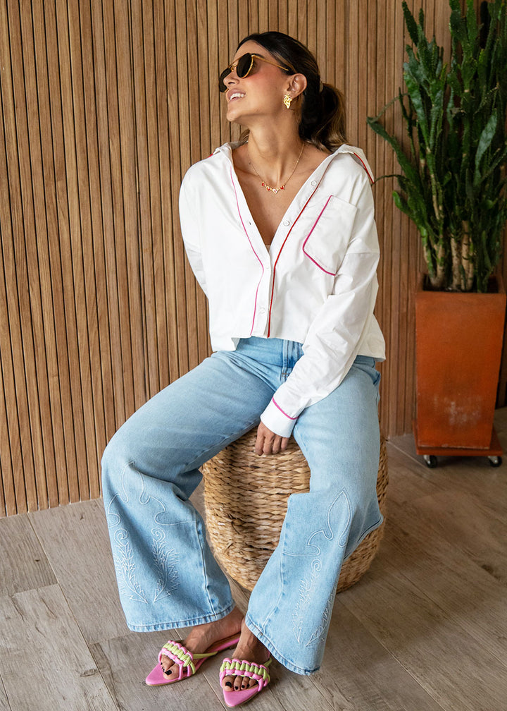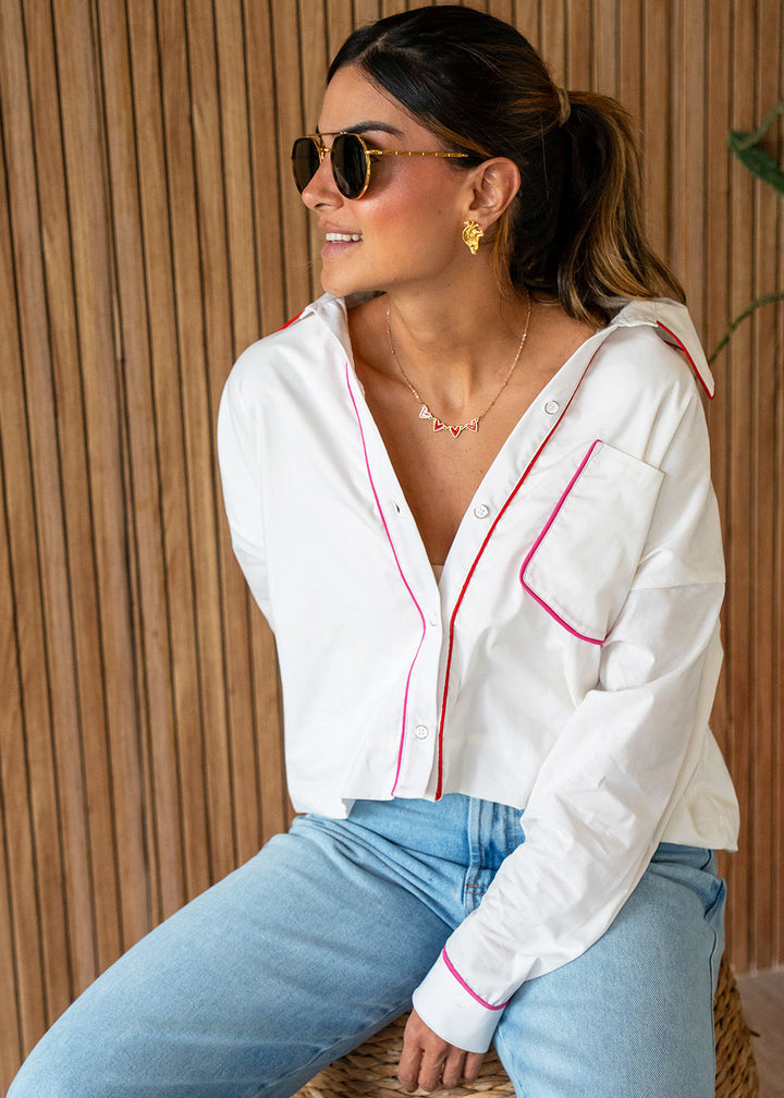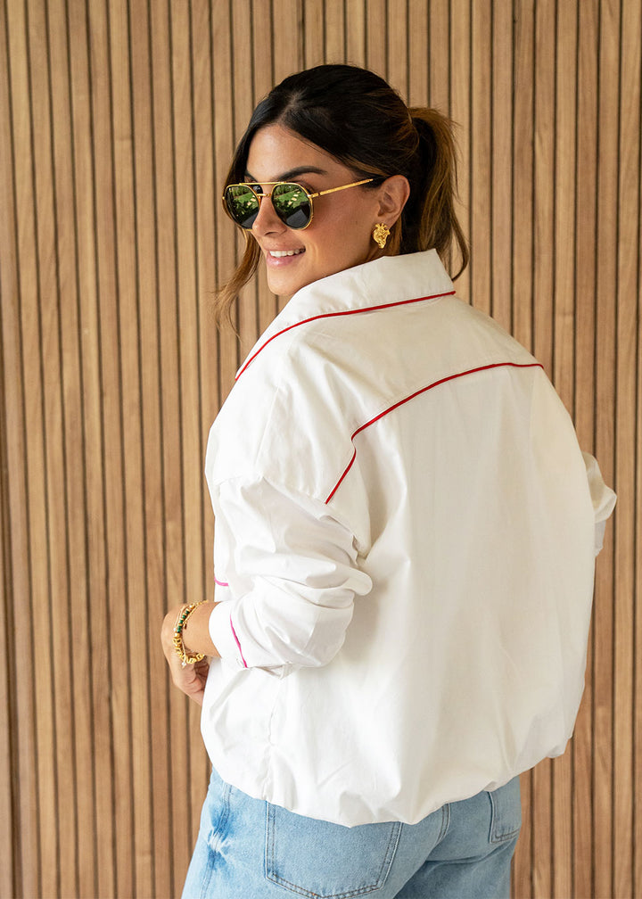 Camisa en popelina color marfil con vivos colores . Cuello con banda, manga larga, perilla y puños con botones, bolsillo en frente, elástico en ruedo para dar bombacho y almilla en espalda.