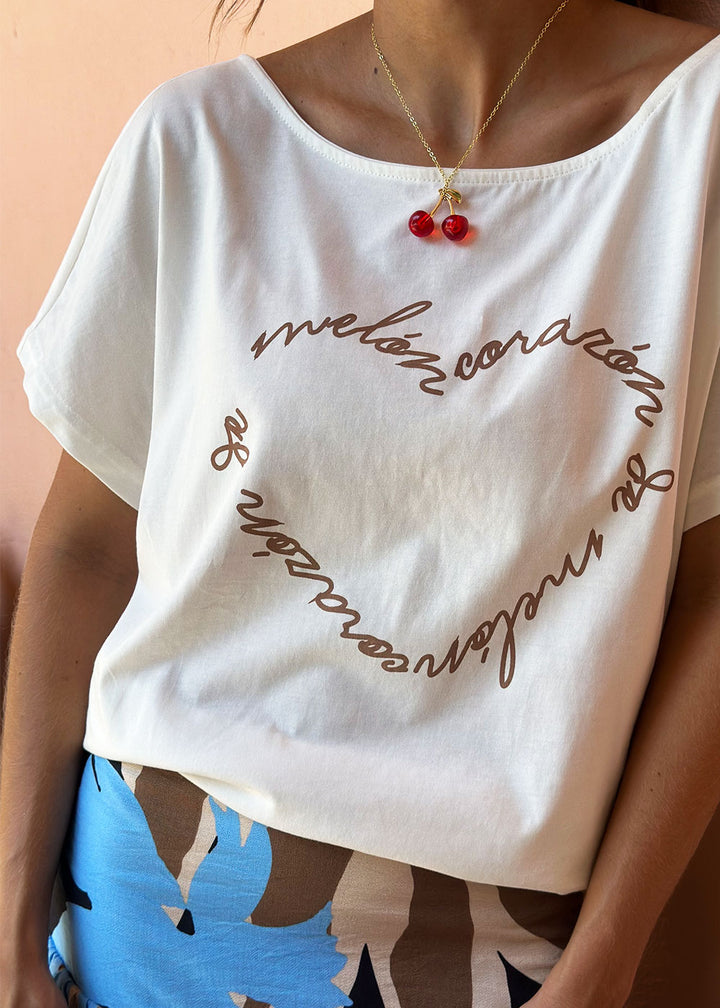 Camiseta en tejido de punto color marfil. Escote redondo en frente y escote profundo en espalda. Lleva estampado en centro frente, además, tiene una tira horizontal en la espalda para sostener el escote.