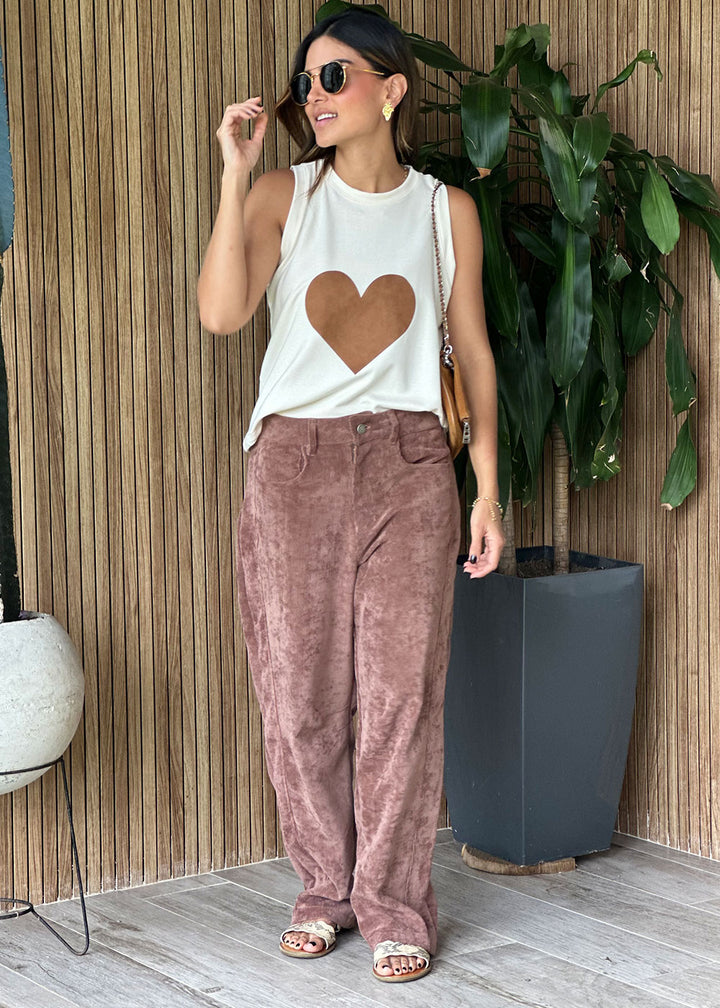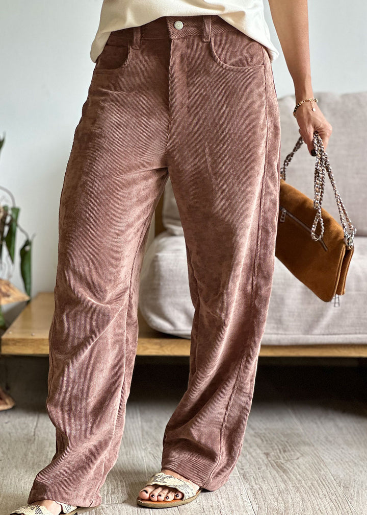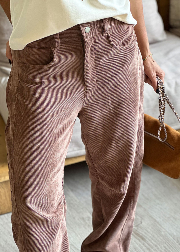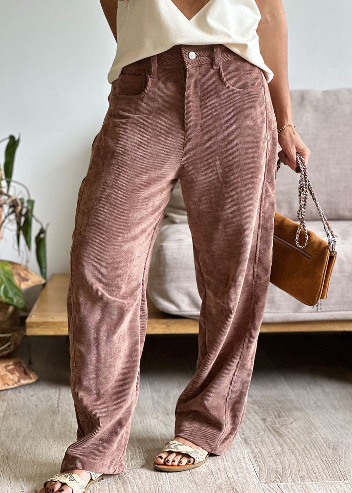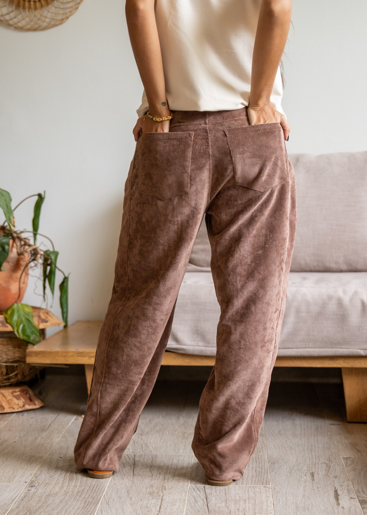 Pantalón en Corduroy color café. pretina con pasadores, bolsillos funcionales en frente y posterior, cortes en laterales y pinzas a la altura de la rodilla.